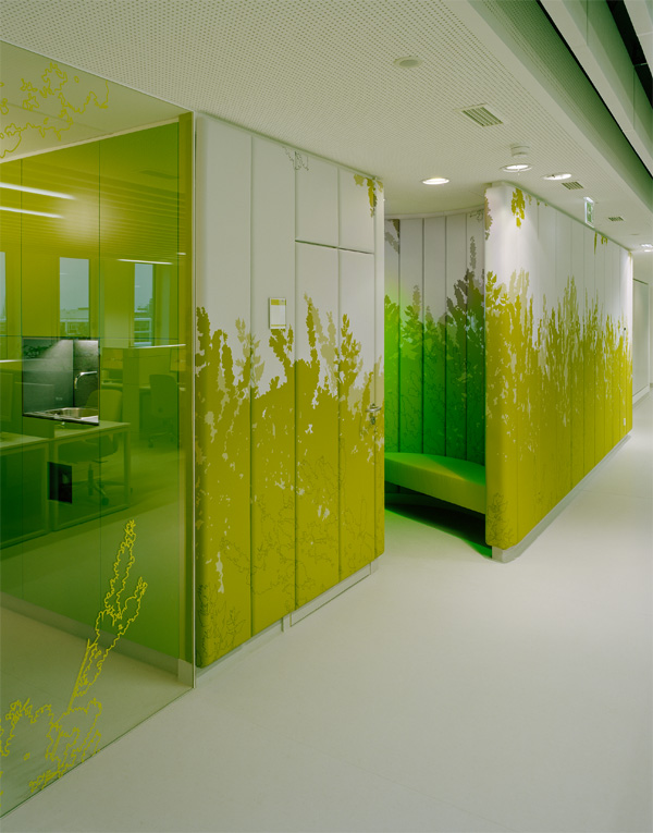 The decorative outer walls of the interior spaces – imprinted with the green park motif – function as the most important acoustical absorber. At the same time they are removable and allow the employees to determine the level of communication of concentration needed for performing the tasks effectively.