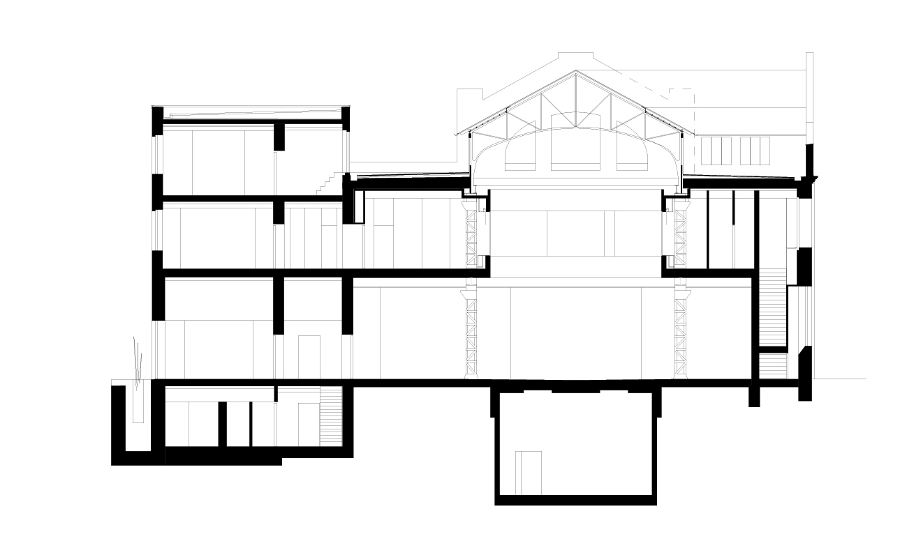 The previously open gallery surrounding the hall is enclosed with pre-cast concrete elements and a continuous frameless glazing providing views into the hall. It is a climatically separated structure containing offices, workshops and studios.