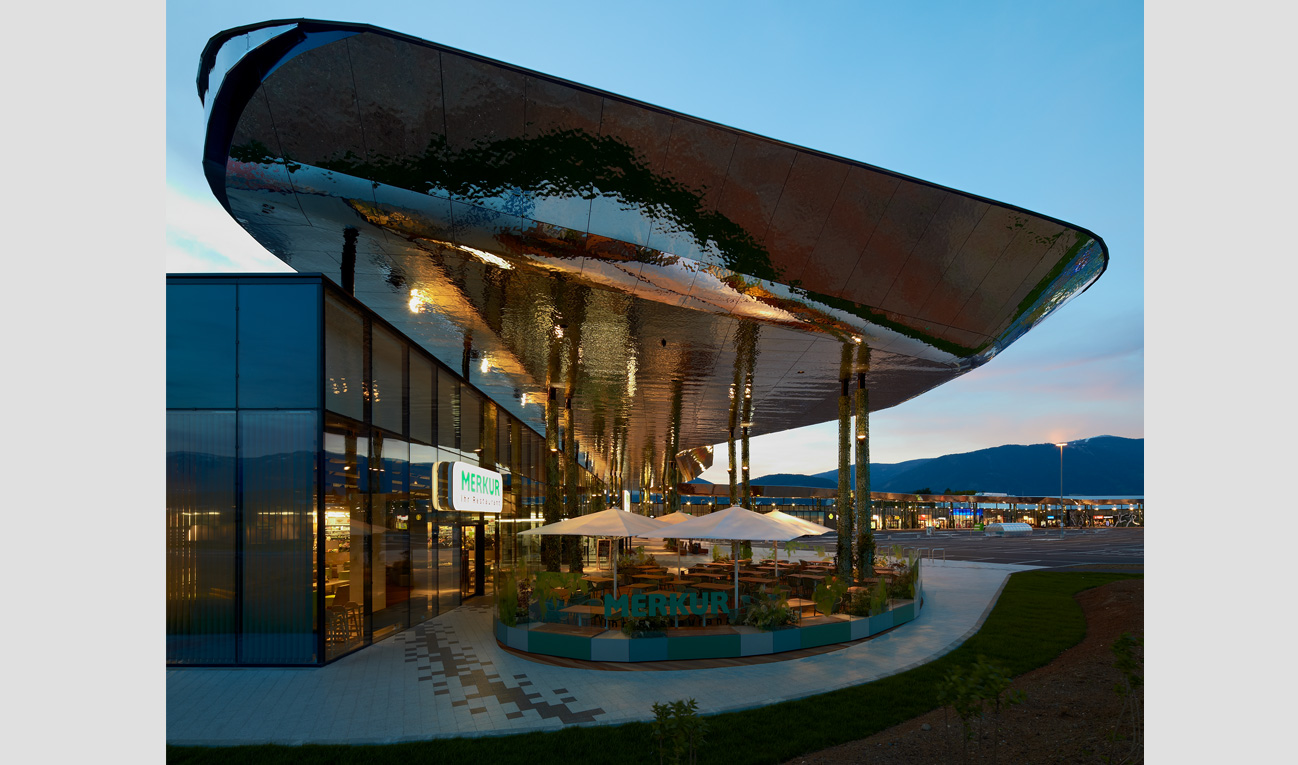 The Neukauf Villach is an ideal social venue, whose qualities are enhanced by a comfortable outdoor dining area in front of the food market, by another green outdoor dining area at the end of the shopping boulevard as well as by an exquisite gastronomy pavilion situated in the center. The first outdoor dining area is protected from the nearby street by a landscaped hill and additional bushes.