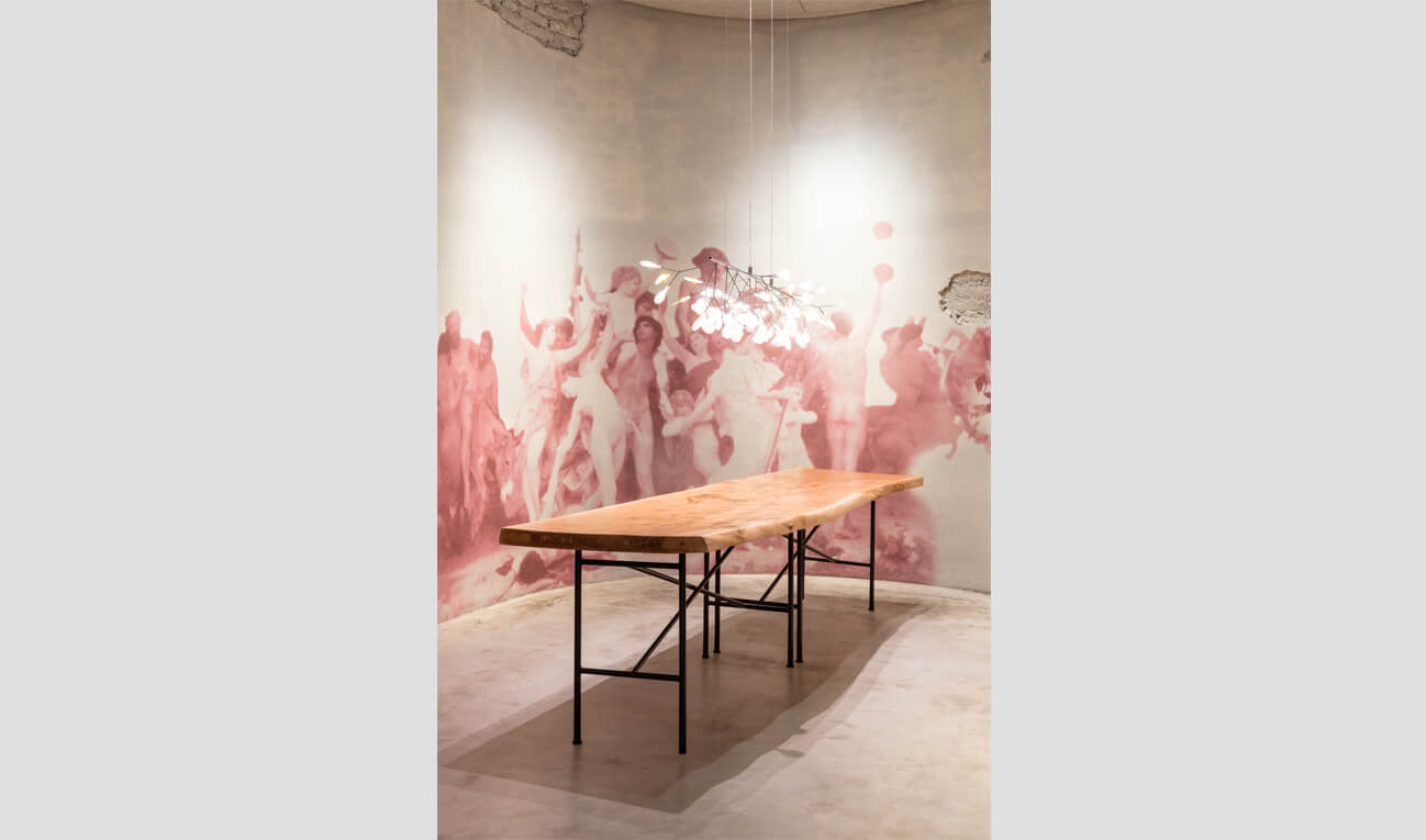 Frescos with sensuous Renaissance and Baroque motifs – nymphs, satyrs, and Bacchus, the god of wine – add a noble touch to the restaurant area, while a dynamic lighting intensifies the effect. This area is designed in the style of a brasserie featuring soft benches and armchairs covered with pinot-coloured velvet that contrast with the raw and blank room shell. Here, the motif of the mirror, which is an important element of furnishings in traditional brasseries, was exceeded. Stramineous mirrors correspond to the coloured lamps developed specially for this architectural project. The reflections dissolve the hard contours of the room and, like the seating, make reference to the colour of red and white wine.