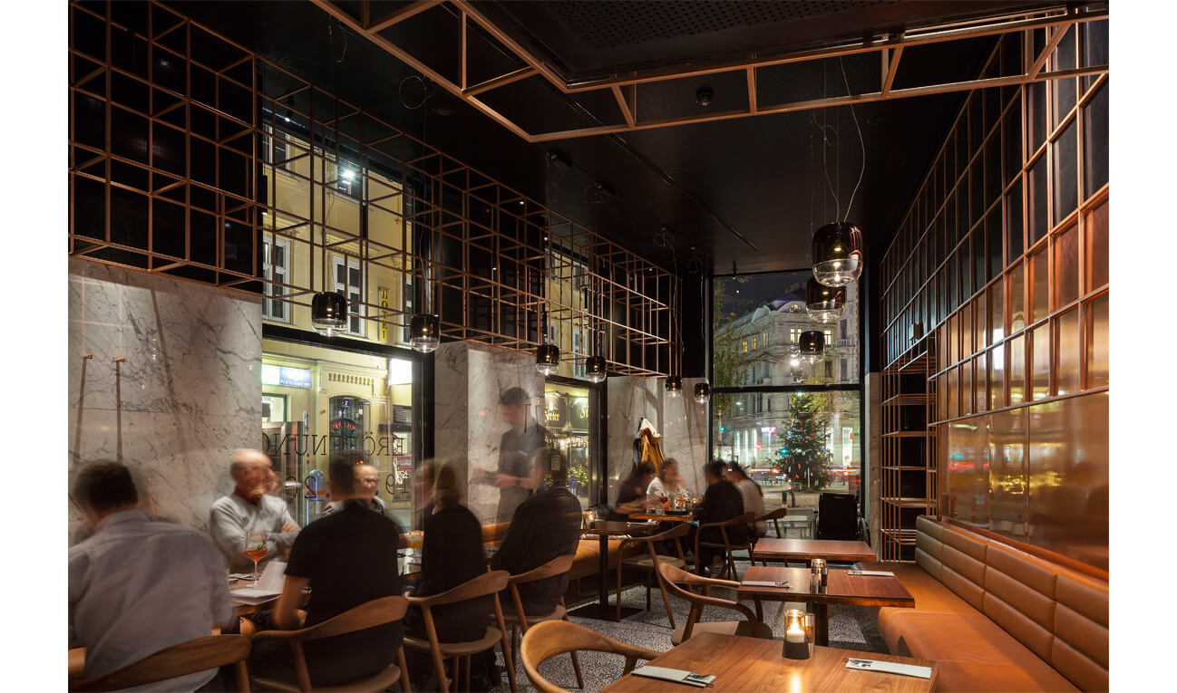 On the right side of the main room, the visitors are directed through shelf-like copper grid, in a high, inviting guestroom. Clad in marble, it makes reference to the timeless culture of an Italian tavern, where guests can enjoy a snack and read the newspapers. The adjoining lowered ceiling area includes private dining spaces in form of niches and lounges reserved for larger groups and events.